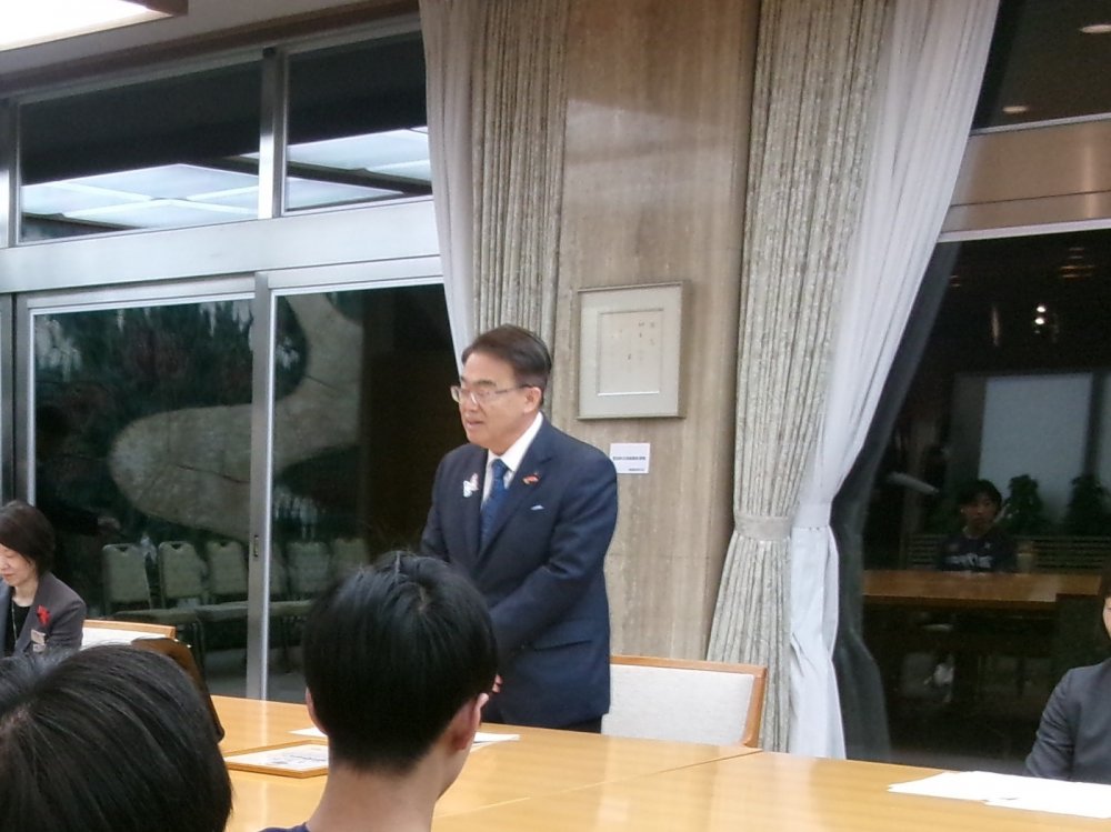 大会の結果を述べる選手(写真左)と、お祝いの言葉を述べる大村知事(写真右)