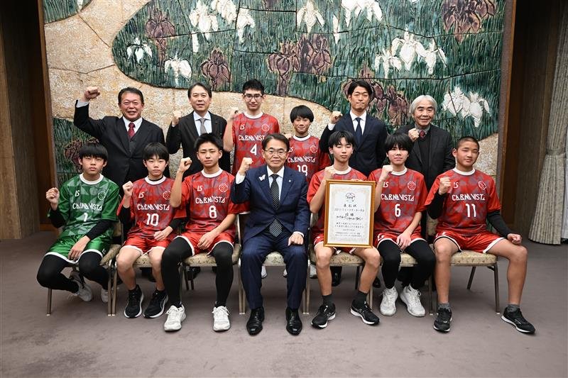 「第2回ビーチサッカーU-15 フェスティバル2025」で優勝した 「カルナヴィスタビーチサッカーアカデミー」の選手及び関係者が、知事を表敬訪問したよ!