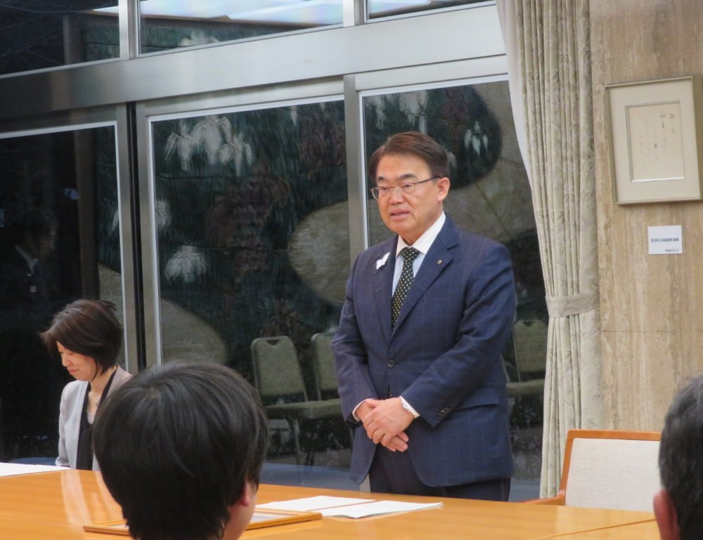 大会の結果を述べる選手(写真左)と、お祝いの言葉を述べる大村知事(写真右)