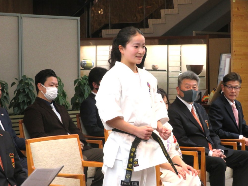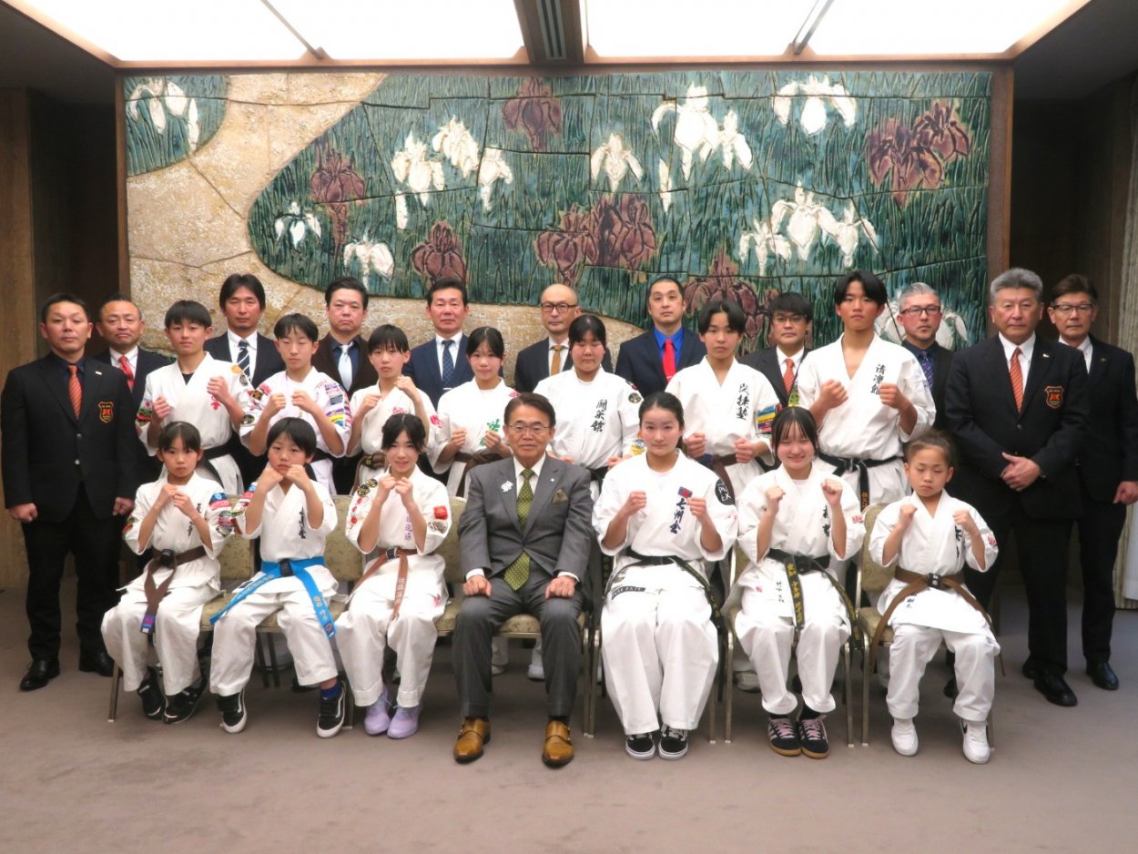 「文部科学大臣杯第19回JKJO全日本ジュニア空手道選手権大会」の各階級で優勝した選手及び関係者が、知事を表敬訪問したよ!