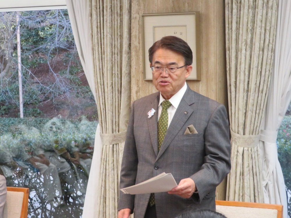 大会の結果を述べる選手(写真左)と、お祝いの言葉を述べる大村知事(写真右)